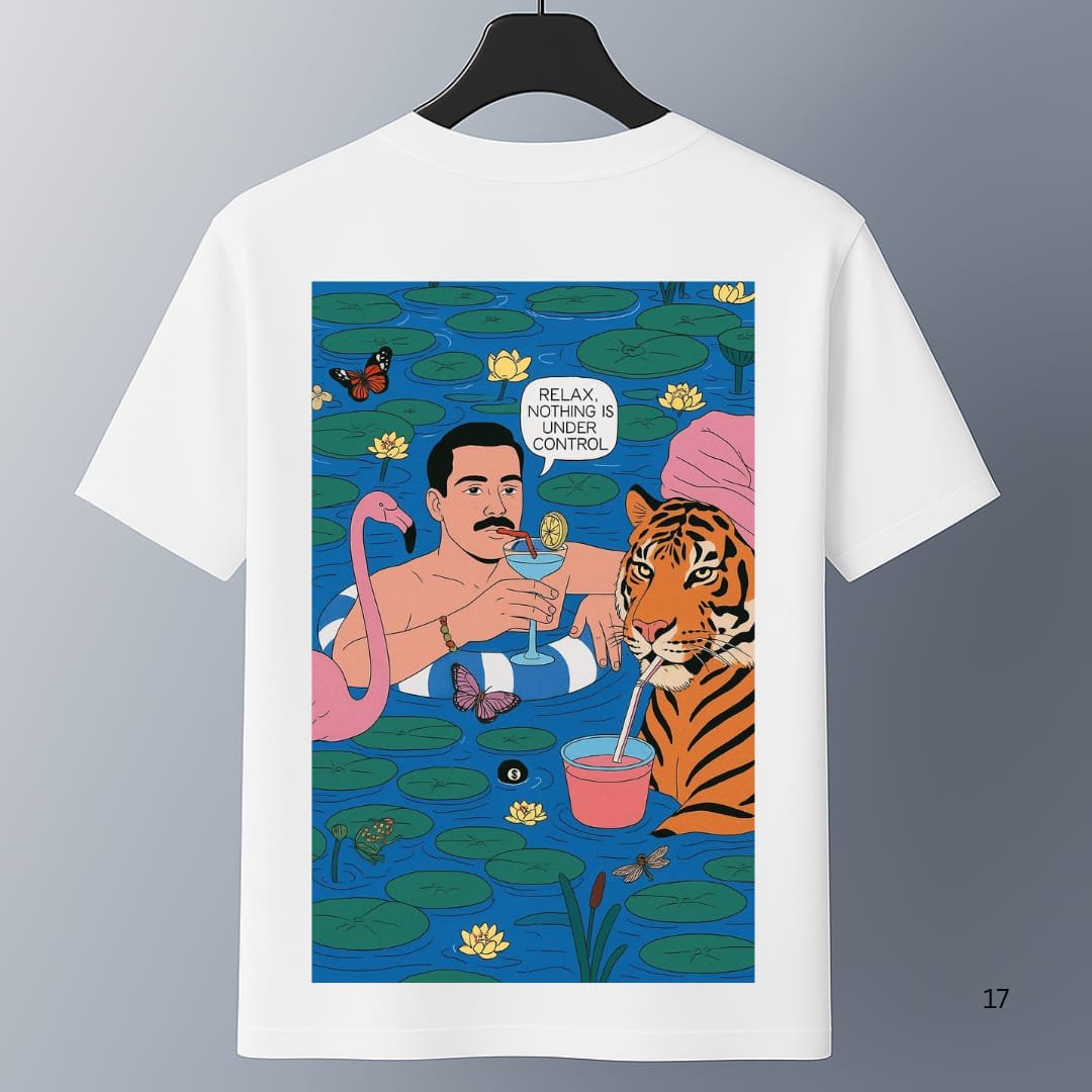 Unwind in style with our Relax oversized t-shirt, where surreal art meets laid-back attitude. The back graphic drops you into a lotus-filled lagoon alongside a flamingo, a lounging figure sipping a citrus cocktail, and a tiger cheekily sharing your straw under the motto “Relax, nothing is under control.” Printed on ultra-soft, premium cotton with a roomy drop-shoulder fit, this tee delivers comfort and undeniable personality. Perfect for those who celebrate life’s unpredictable moments—wear it anywhere you crave carefree vibes.