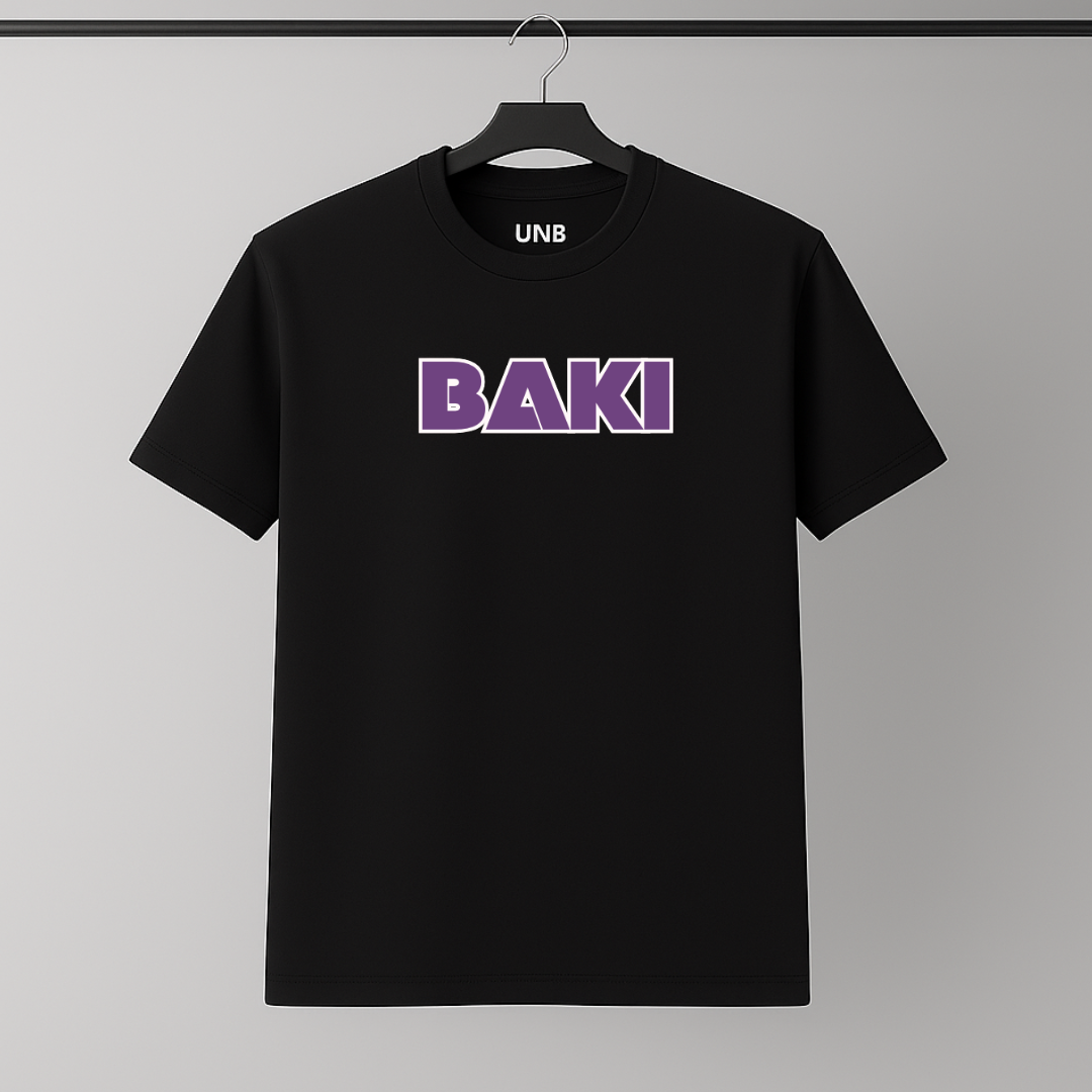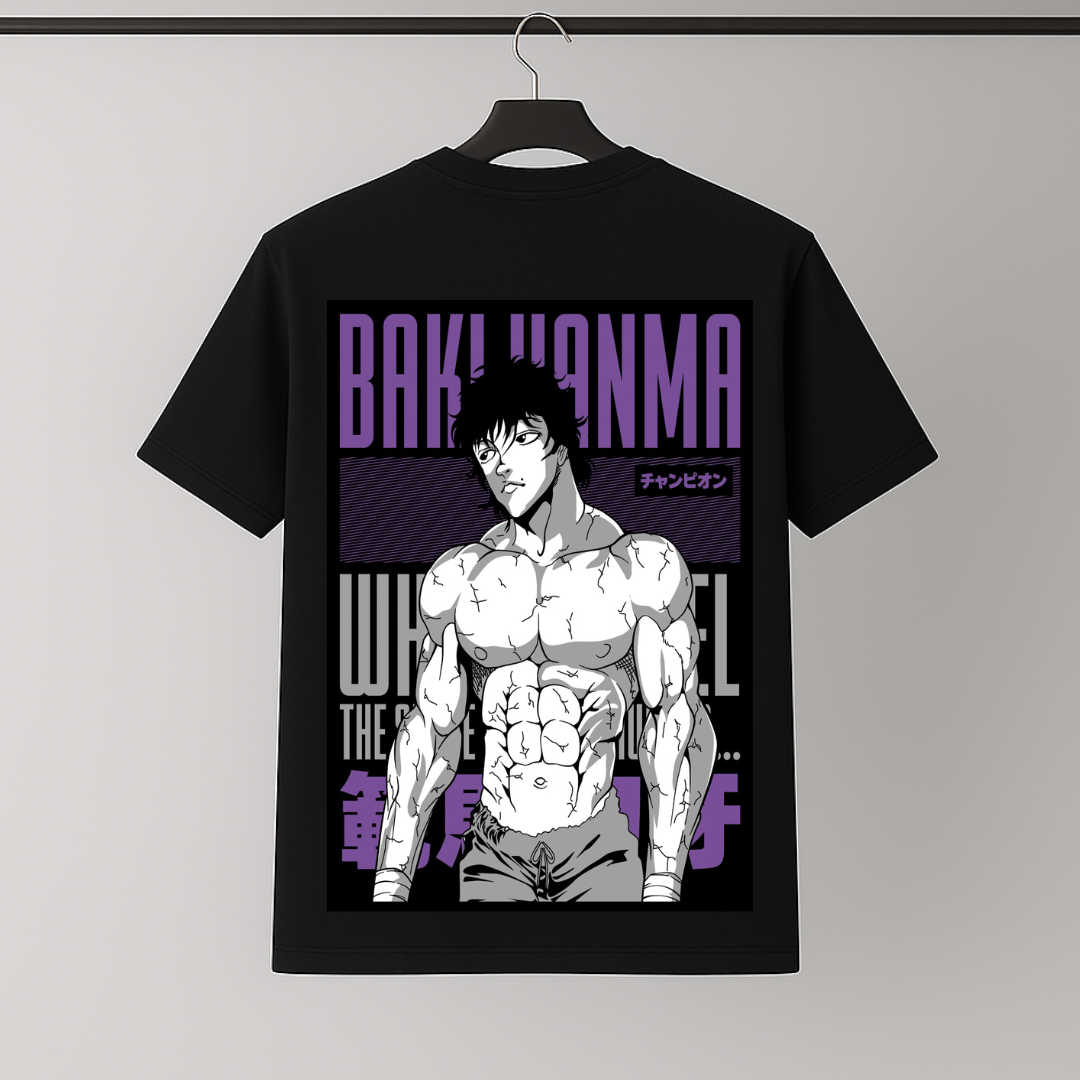 Baki Exclusive oversized T-shirt for men Unleash your fighting spirit with this bold BAKI HANMA oversized T-shirt. Featuring a sleek BAKI logo on the front and a powerful full-back graphic of Baki Hanma in striking black, white, and purple tones — this tee is perfect for anime fans and streetwear lovers. Crafted premium with a relaxed oversized fit, it offers all-day comfort and standout style. Ideal for casual outings, gym sessions, or anime events