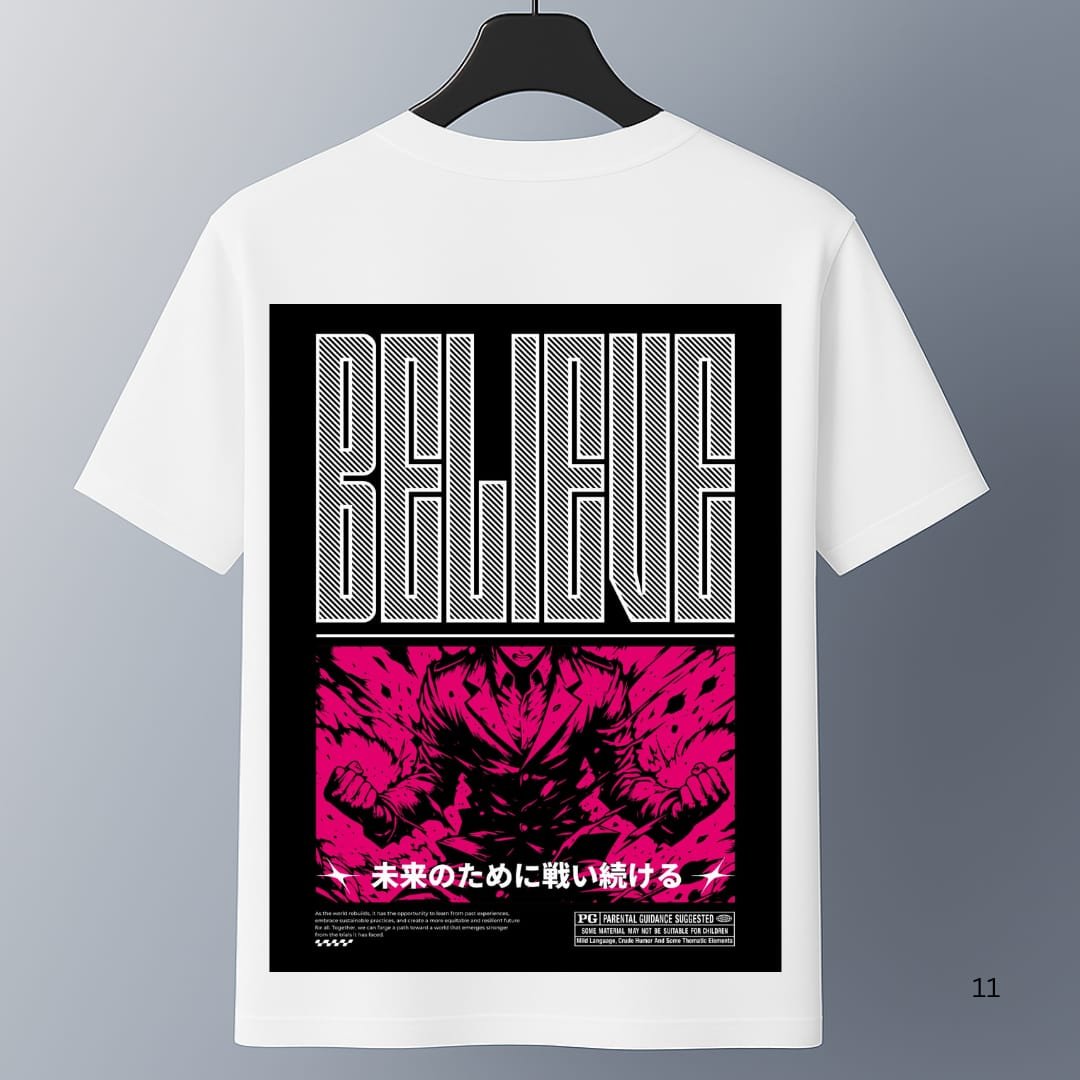 Unleash unstoppable energy with the BELIEVE oversized t-shirt — where bold typography meets powerful anime-inspired art. The front speaks confidence with a sharp “BELIEVE” print, while the back showcases a fierce graphic radiating rebellion and strength. Crafted from premium cotton, this drop-shoulder piece offers all-day comfort with standout style. Whether you’re chasing dreams or conquering challenges, this tee reminds you to trust your inner fire. A streetwear essential for those who wear purpose and passion.