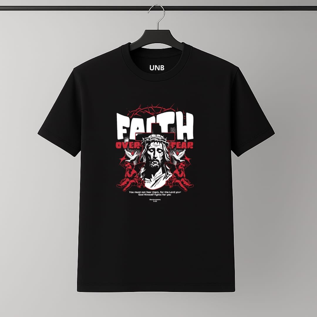 Faith Over Fear black oversized t-shirt. Embrace your belief, conquer your doubts, wear the power of divine courage