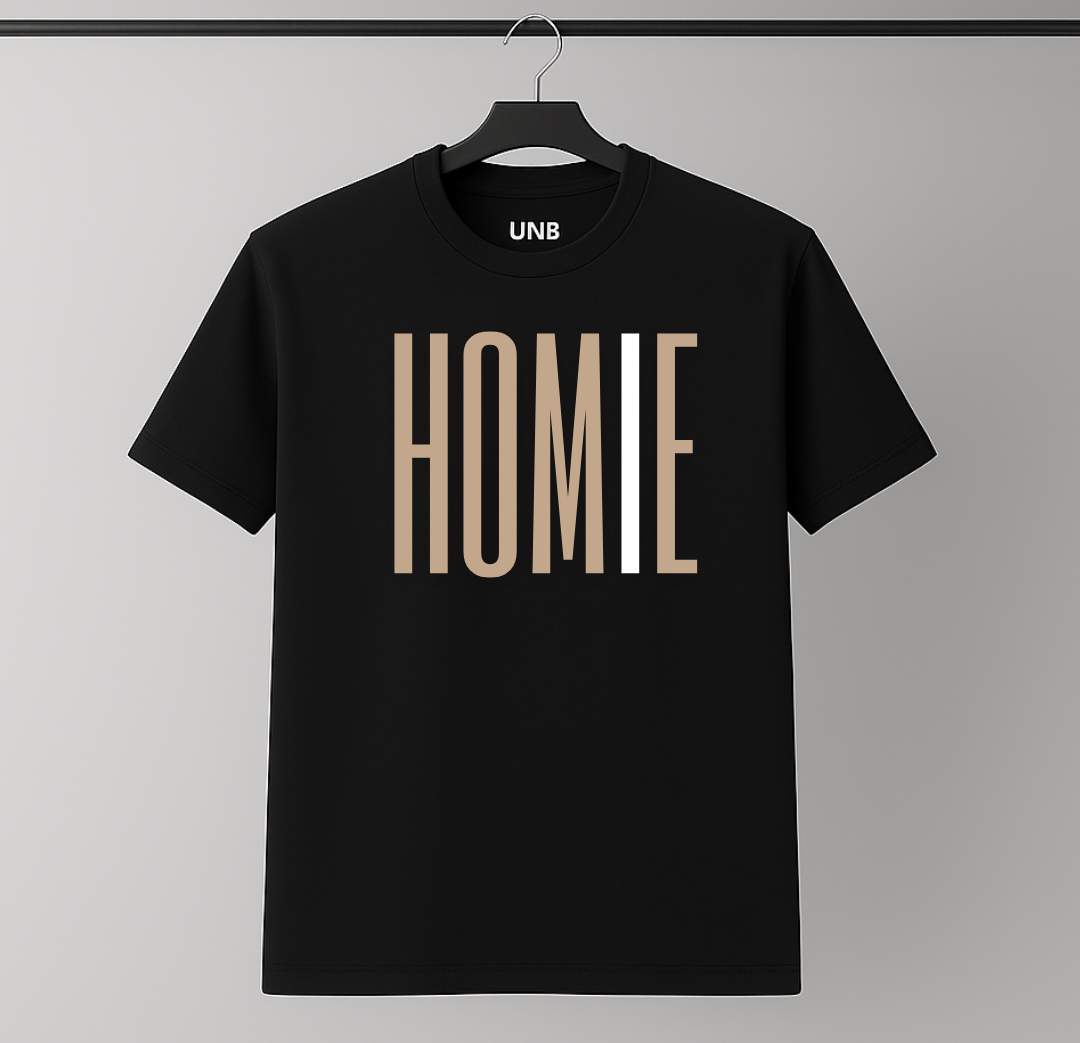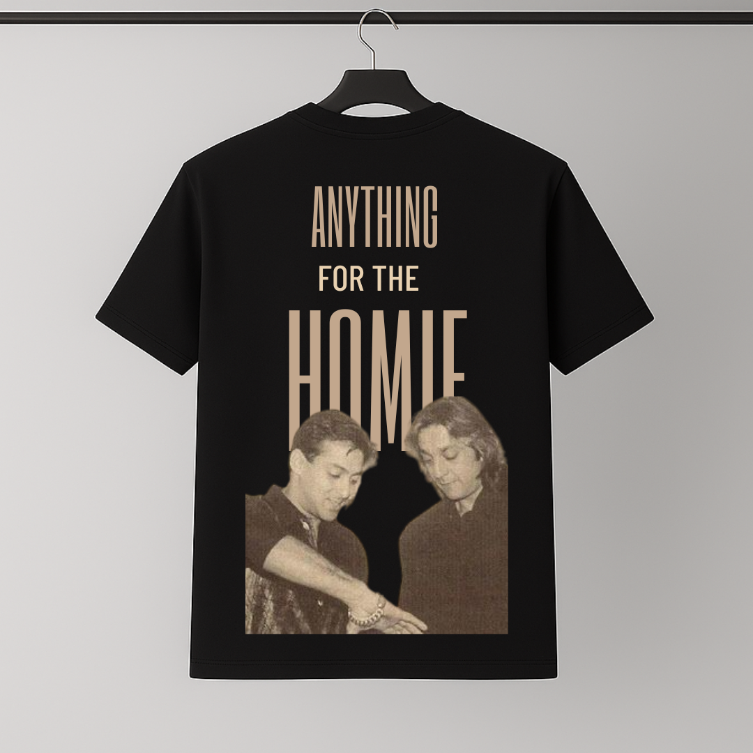 This black oversized tee features a bold, vertically stretched “HOMIE” print on the front — clean, minimal, and powerful. The twist lies on the back: a nostalgic sepia-toned photo of two iconic friends, paired with the phrase “ANYTHING FOR THE HOMIE”. It’s a tribute to loyalty, brotherhood, and the unspoken bond between close friends.