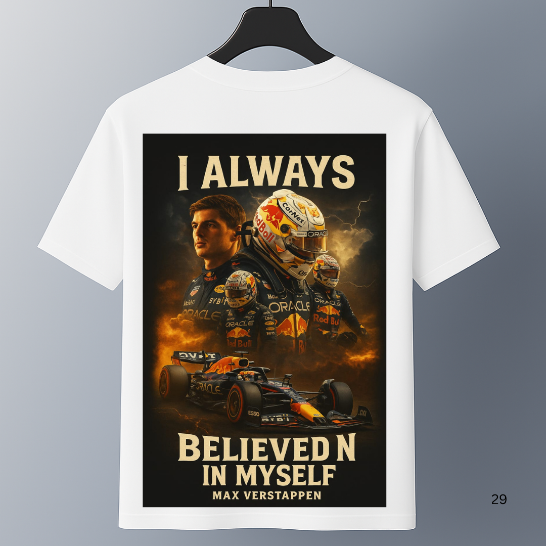 The “Max Clutch” white oversized t-shirt is inspired by Formula 1 icon Max Verstappen. Featuring bold front text and a dynamic back graphic, this tee celebrates unwavering belief and high-octane ambition. With the quote “I always believed in myself,” it’s a tribute to those who thrive under pressure. Designed for fans of speed, strength, and self-belief, this piece brings both comfort and confidence. Made for those who never back down—on or off the track.