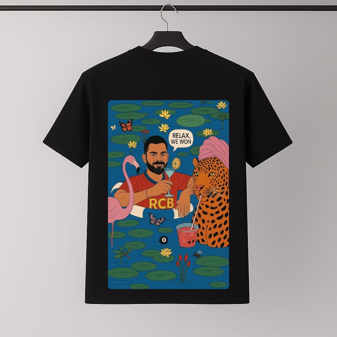 Step into the winning zone with this Loyally Royale black oversized t-shirt. Featuring a vibrant, playful back graphic of an RCB celebration, this tee embodies loyalty, royalty, and victory. Crafted from premium fabric for ultimate comfort and bold street style. Perfect for fans who live for the thrill of the game and the joy of the win. Pair it with your favorite jeans or shorts and let your style speak of passion, power, and pride. Relax, you’ve already won